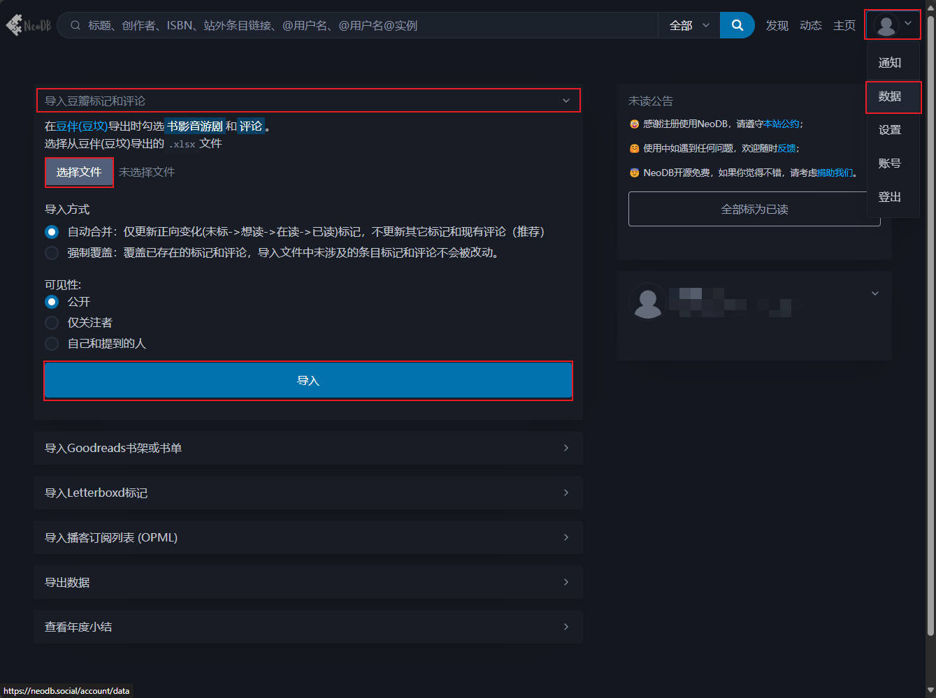 点开右上角头像数据,展开导入豆瓣标记和评论,点击选择文件,在弹出的文件选择弹窗中,选中刚刚导出的Excel文件,点击导入。NeoDB会提示后台正在导入,此时稍等片刻。