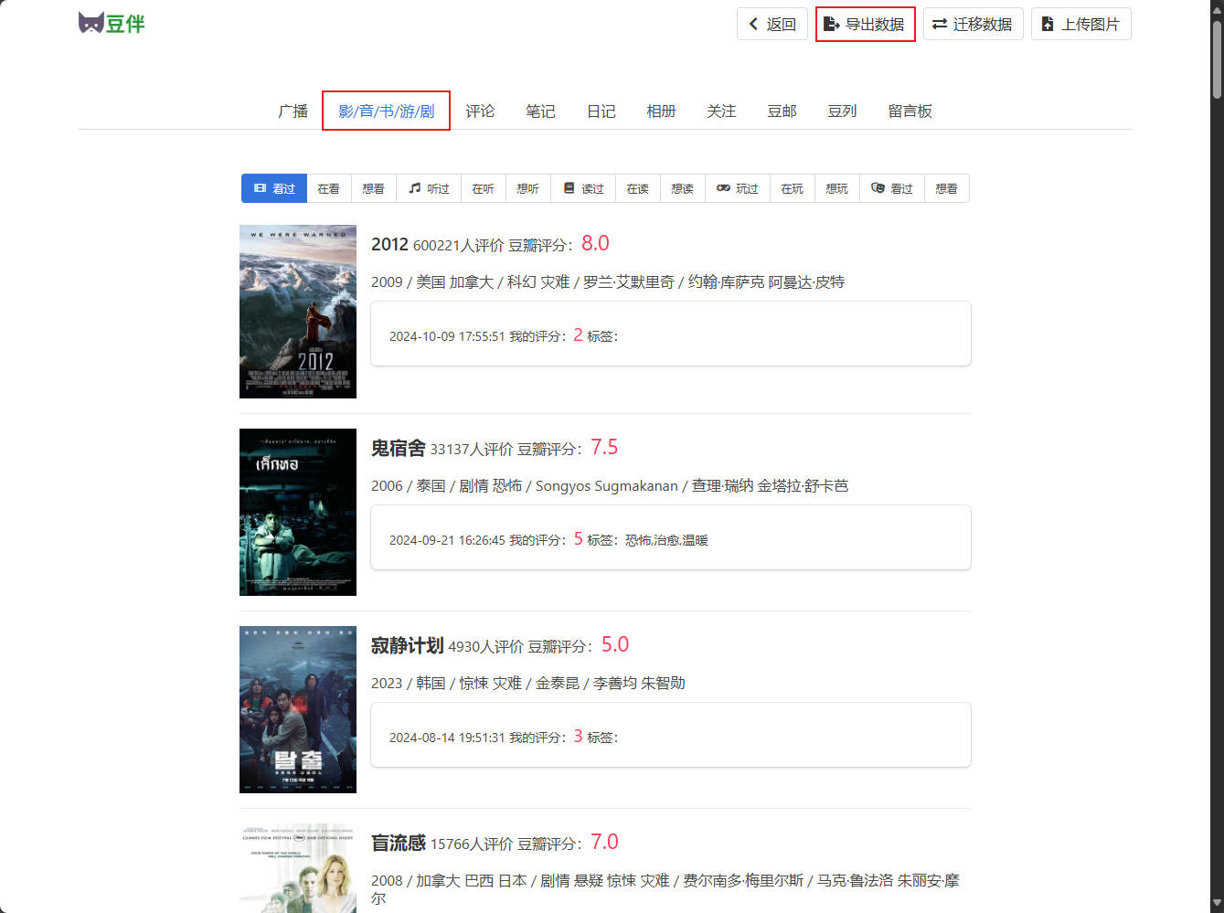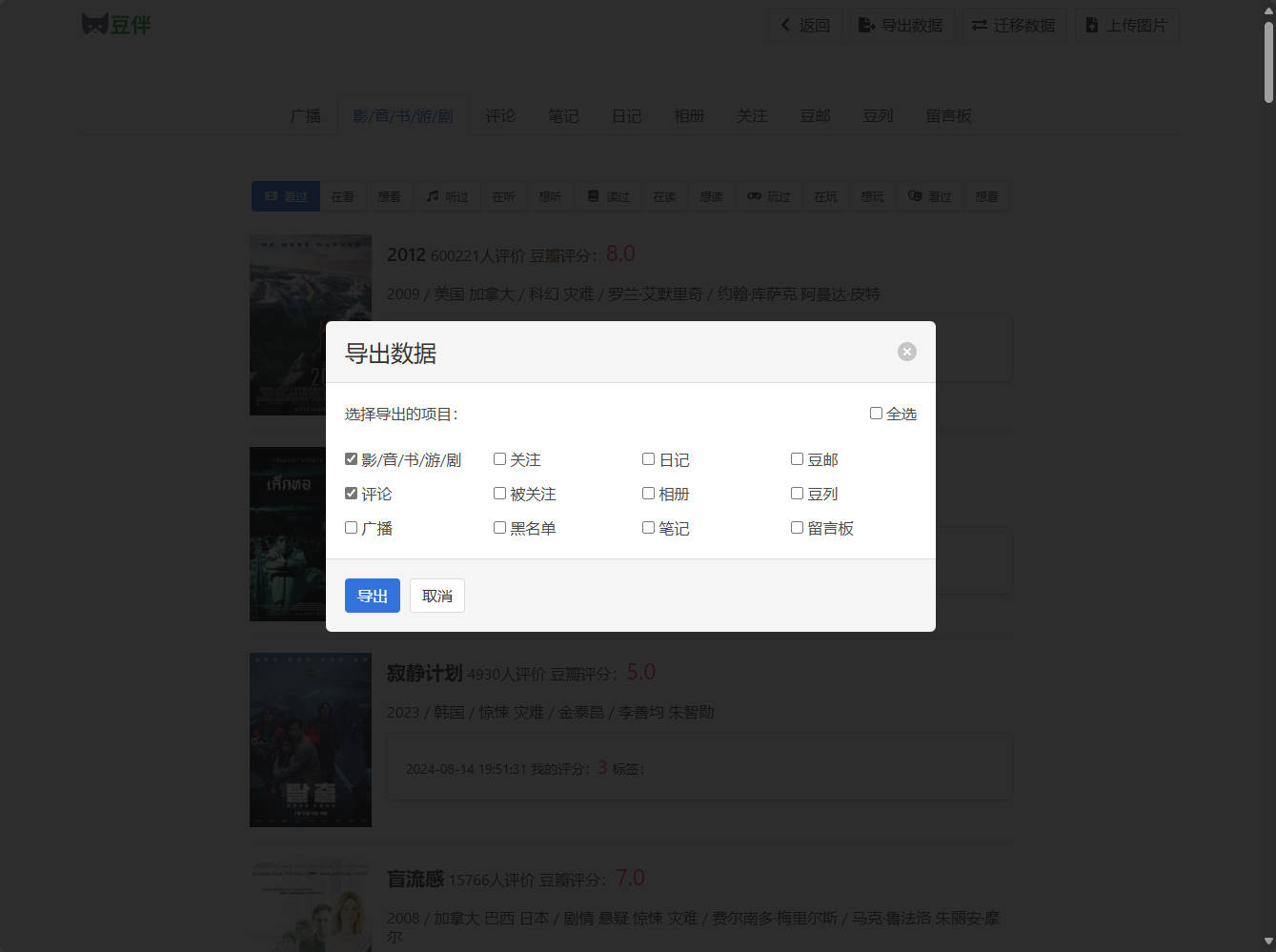 点击右上角导出数据,同样勾选影/音/书/游/剧和评论,点击导出。