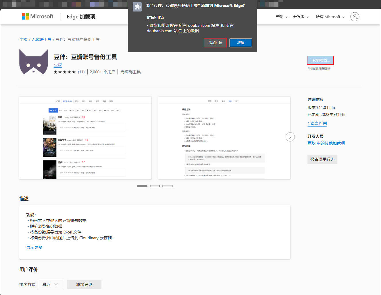 此处以Edge为例,在浏览器中找到获取Microsoft Edge拓展,然后搜索豆瓣,找到豆伴:豆瓣账号备份工具,点击获取,然后添加扩展。